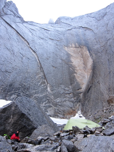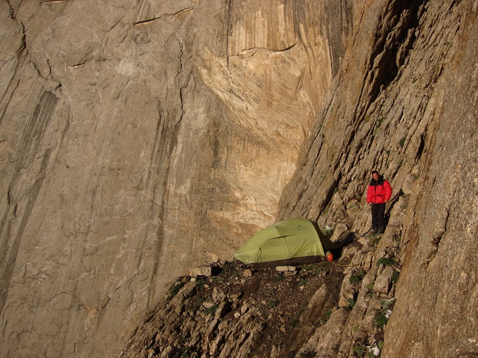 Ставим лагерь. Ночёвки здесь шикарные. Большая ровная полка под палатку и чуть ниже в 15 метрах снежная доска. Это радует, потому что на стене кроме дневных ручейков воды не было и поэтому тащили бурдюк с восемью литрами воды.