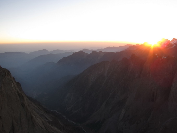 Вниз опять долгие и муторные дюльфера с классическим застреванием верёвки и выходом на «землю» уже в темноте. Похоже, эта парадигма преследовала нас на все восхождения в Каравшине. Спускались вместе с екатеренбуржцами. В лагерь пришли уже за полночь.