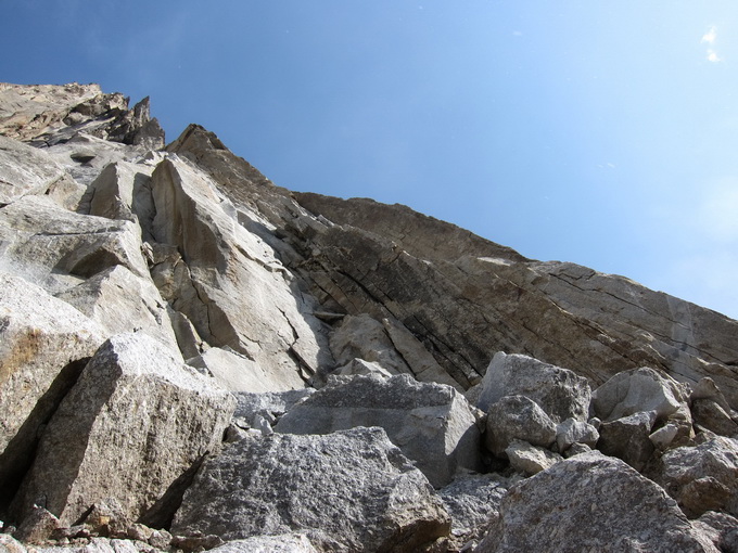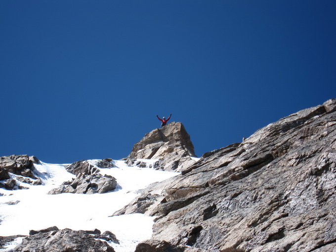 По описанию иркутов дальше всё ложится. Это было действительно так.Чуть-чуть. Лазание ускорилось, но ориентирование съело весь выигрыш. Пару раз за день пришлось делать большие маятники вбок, чтобы посмотреть куда лезть. Приближался предвершинный гребень. Стали попадатся куски снега, которые приходилось облазить по скалам. Это замедлило темп.