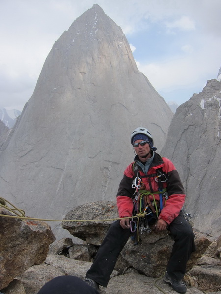 На 11 верёвке вылезли к штатным ночёвкам, там заночевали и на следующий день к 3 часам вылезаем на вершину. Здесь, стоя на самом верху Асана, особенно поражаешься видом 4810. Она со своей северо-западной стеной, как огромная пирамида возвышается над окрестными вершинами!