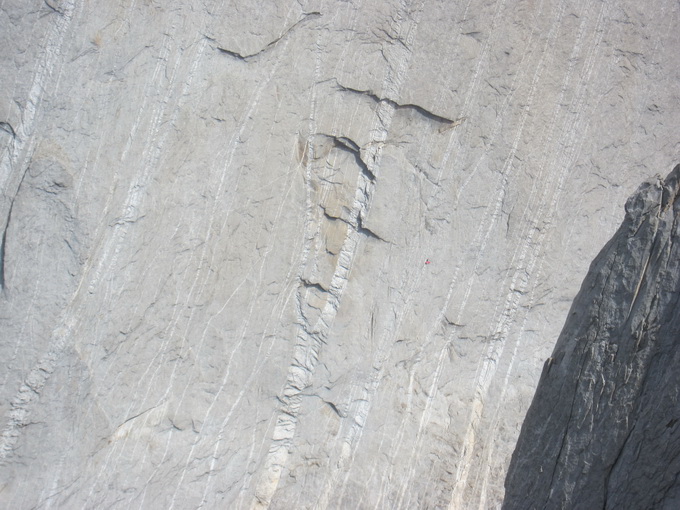 С утра мы с Костей рванули на свой маршрут. С первых верёвок стало ясно почему маршрут перестал пользоваться популярностью – рельеф поменялся, стало много живья и пыли. Пролезли 7-8 верёвок до первых штатных ночёвок. Зрелище унылое – всё заровняло конгломератом камней и песка. Дальше должен быть ключ, но он обвалился. Немного помыкавшись и поискав новый заход на стену мы плюнули и сдюльферяли. Благополучно увернувшись от всех летящих камней, и навешав своих дюльферных петель, к темноте спустились в кулуар.