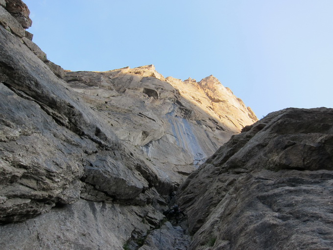 На 4ом дюльфере догоняем иркутян. У них застряла верёвка, снимаю им её и как назло сами засаживаем в этом месте свою. Тут уже приходится лезть, за нами никого нет.