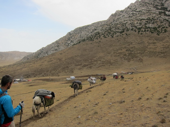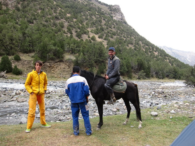 Всё когда нибудь заканчивается, вот и мы двинули на Родину. Спуск был пешком, а груз везли на осликах. Перед стартом хитрый погонщик ослов попытался заломить более высокую цену за транспортировку груза, но Саня Иванов очень мастерски отбил эту жлобскую атаку и мы с опозданием на час двинулись вниз. Погонщики оказались неопытные, ослы всю дорогу падали из-за косячного крепежа груза и неправильной логистической политики киргизов.