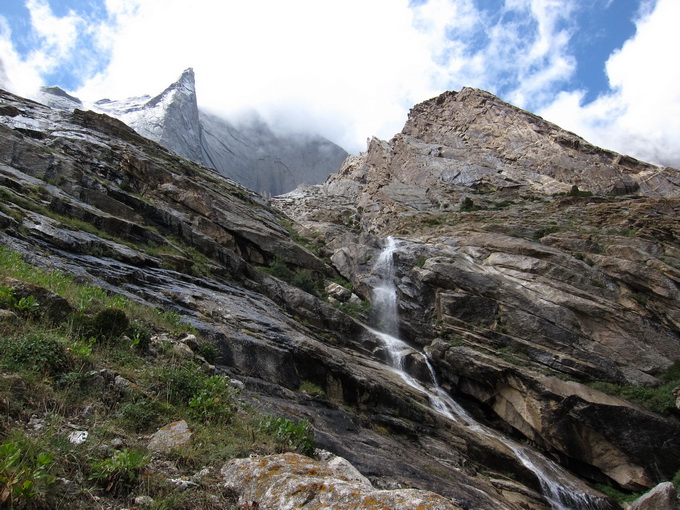 Следующий день вышли на подход в соседнее ущелье на ночёвки под стену. Весь день то солнце, то унылый дождь. Но сам подход не вызвал затруднений. Проскакав по бараьим лбам и сыпухе за 6 часов, добрались в восточный цирк 4810. Набрали почти 1 км.