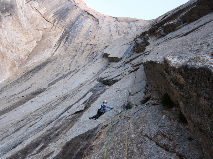Второй день – копия первого. Лезем, внутренний угол, до полудня солнце, дальше пасмурно и вечером дождь со снегом. Вылезаем на плечо часов шесть вечера. Обрабатываем две верёвки вверх.