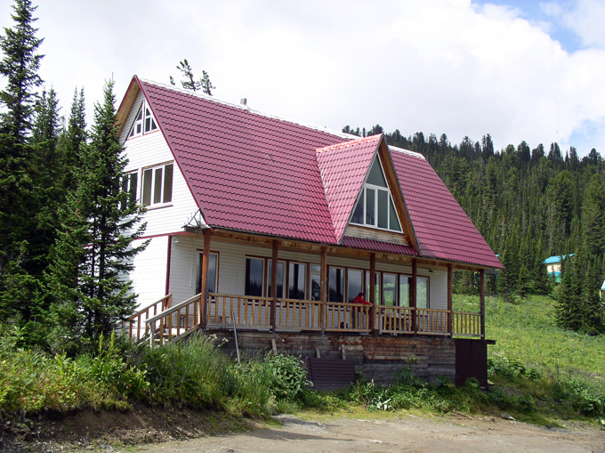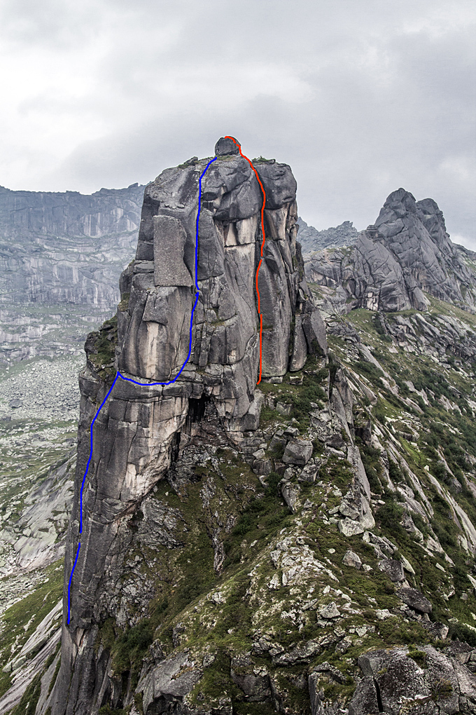 К этой скале присматривались давно. И изначально планировали сверлить длинную спортивную линию метров на 130 с Запада, (синий на фото) с подходом от озера Радужного. Но оказавшись 3 августа на горнолыжке Снежной, поняли, что погода в этом году не даст делать такой проект. Из шести дней только три можно было условно назвать хорошими. Три других дня лило и гремело. С уютного крыльца Снежной три дня наблюдали картину, как молнии огненными щупальцами щекотали Голову и пик Молодёжный.