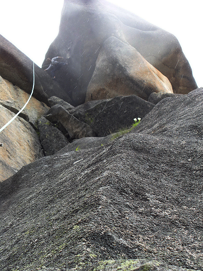 Сложный момент наверху - камин: вход в камин лезется даже по дождю, но точки поставлены так, что использовать их для прохождения и прихватываться за них не получится. Фишка маршрута - самые «бодрые напряжно - эмоциональные шаги» делаются с риском вылета из камина и повисанием на шлямбуре в отвесе. И только после пролаза в два красивых движения можно достать до уха.