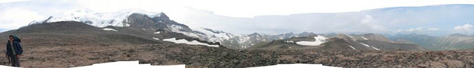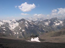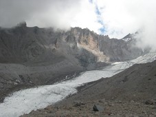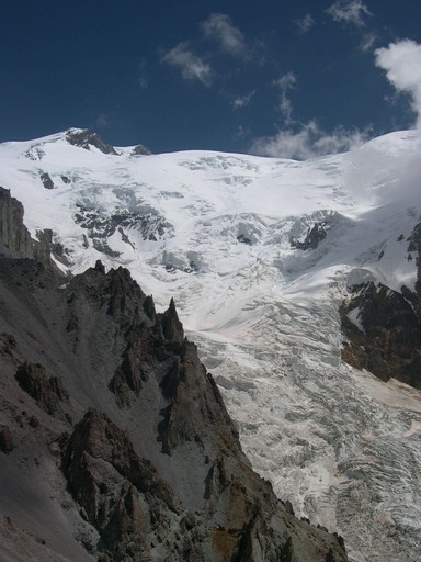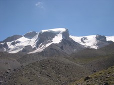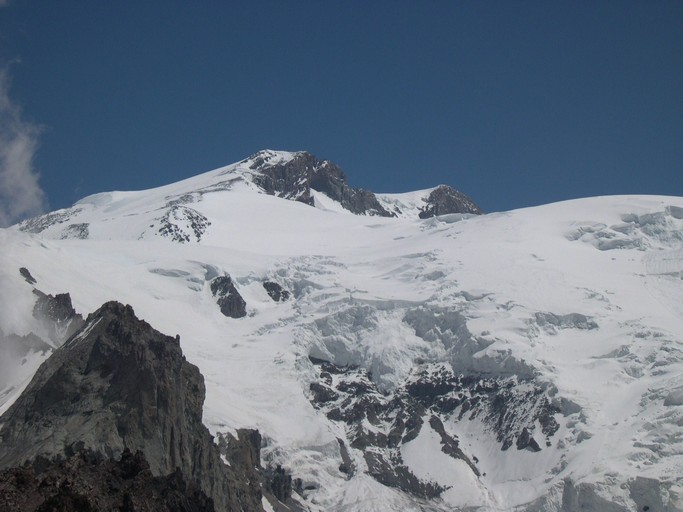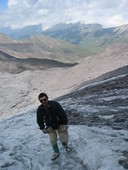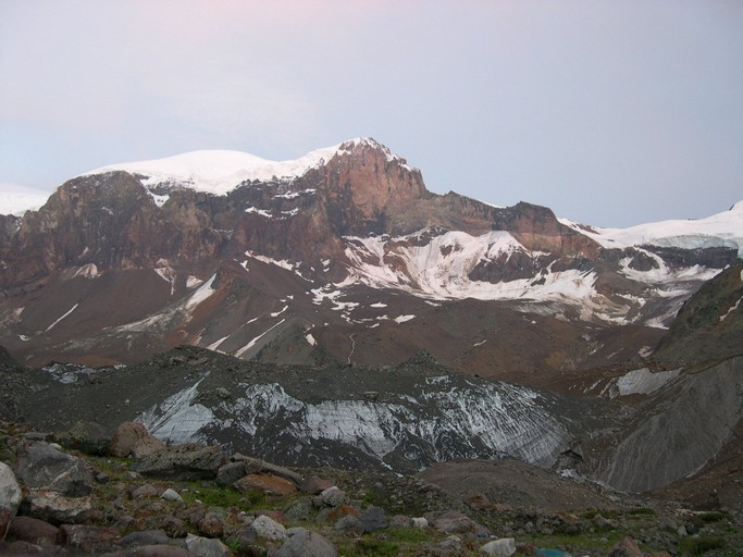 Вообще ничего особенного на Фрунзе не было – так что приключение – это для красивого слова. Замечателен Фрунзе следующим: во-первых, 4000 м, во-вторых, 2а, в-третьих, все нормальные люди ходят его со стороны Малки, поднимаются по леднику на букву «У», и основное препятствие у них – бергшрунг (или что-то около того) – это тоже самое что рантклюфт, но наоборот. А мы шли со стороны Битюктюбе, там основное препятствие - нависающая сыпуха – градусов в 40. Подход там простой – есть кошки – иди по леднику – в августе он открыт, трешин не много и они узкие, нет кошек - по левой (если наверх смотреть) морене, а потом все равно по леднику, подходишь под ледопад и слева сыпуха начинается – вам туда. На седловине встретили группу, которая как-то подозрительно косилась по направлению вверх – по хребту, мы тоже туда косились.... не менее подозрительно.