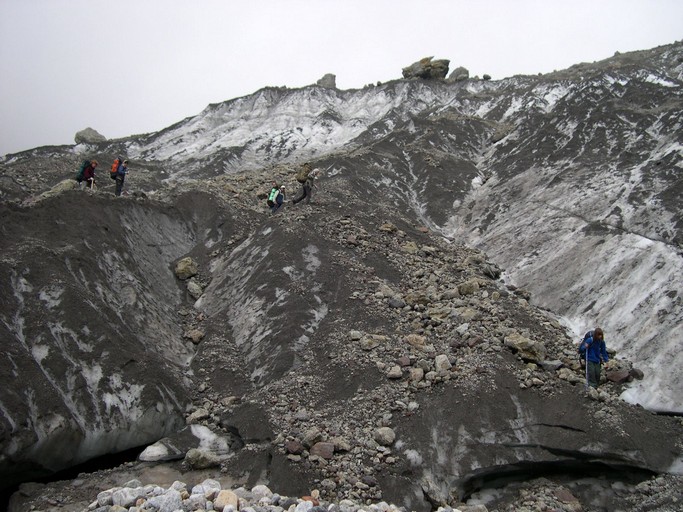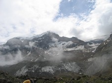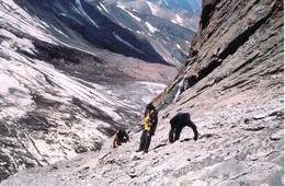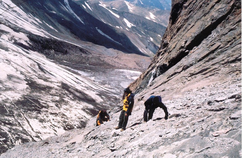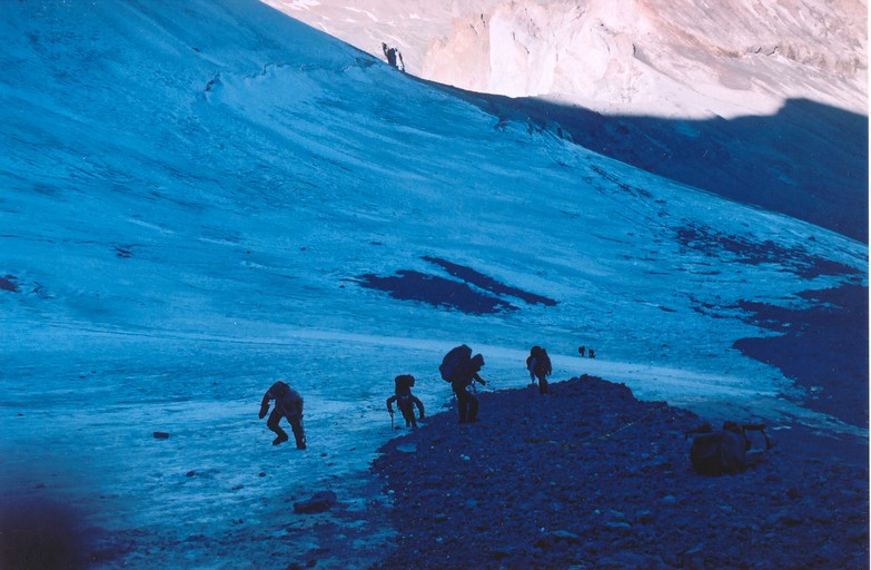 Обвязались верёвками, как Сталоне в скалолазе и ломанулись, а эти коврики постелили и чай попивают – на нас сморят. Ну мы и одновременной страховкой и попеременной.... и лицом к склону и спиной, и в кошках и без, в общем показали класс лазанья по миксту..... Приняв стратегическое решение что дальше – непроход, пошли вниз. Там где поднимались 4 часа, вниз за 30 мин. съехали. Обожаю сыпухи, как на сноуборде, хотя я на нем никогда и не катался.