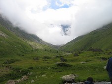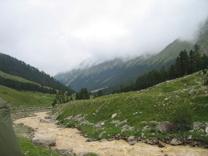 У каждого человека должна быть задница. Так один мой знакомый сказал. Но моя видимо уникальная, везде себе приключение найдет. Это мы уже под ледником Кюкертлю стояли. Проснулся я, как и положено, в 6, из полатки выглянул – серо... мокро, но Кюкертлю видно, Квебек видно – что нам лосям? Подошёл к командирской полатке – пойдем говорю, а мне оттуда – может поспим? Пришлось выполнять. Но в 11 часов, под легкой моросью, в тумане поедая кашу, созрел план – а не сходить ли нам в Хурзук? За ништяками. По карте, на которой Хурзука не было, решили – километров 12-15, наверно, ну сброс-набор 1500 м, эт мелочи. Это потом жопорез сказал, что одного птичьего полета там 17 км.... Сказано-сделано, я Коля, братья меньшие и Витя (Ларс отпал при переправе через ручей по леднику) побежали. Я как самый умный, сильный и опытный темп задаю, а остальные его сбивают. Витя лыжную палку в узел завязал. Дошли до коша, и тут я понял – посветлу сто пудов не успеваем вернуться. И что я решил? Ну конечно дальше! Одно только стратегическое решение принял – разделиться: мы с Колей бежим вниз – остальные в своем темпе топают. Пришли в Хурзук, купили пивка, клюковки..... ну и пряничков с лимонами ещё. И поглотив все это решили – я (как самый ответственный, сильный и умный) вверх бегу, предупредить что мы типа в лавину не попали, в трещину не провалились и не погибли каким другим способом на опасной горной дороге..... А остальные – если совсем тяжко будет - в коше заночуют. Если вы меня спросите, почему я решил, что надо обязательно вернуться в лагерь, то я отвечу – не знаю. Говорю же – самый умный. Короче, просвистал я мимо последнего коша в надвигающихся сумерках и тумане. А к месту впадения Куршоу (и места окончания тропы, по совместительству) в полном мраке. И пошёл дальше. В этом месте долина уже становится и приходится траверсировать травинистые и сыпушечные склоны. Траверсирую я их значит, а где-то внизу – далеко-далеко река шумит, наступил я чуть ниже – и прям в эту реку угодил.... туман блин, что под ногами не разберёшь. Лег отдохнуть и тут же в голове слова всякие завертелись – гипотермия, гипоксия какая-то, Дж. Лондон ещё зачем-то..... Иду дальше и падаю. Иду – падаю. Тут дошло – на четвереньках надо. Хорошо склон крутой – не совсем на четвереньках получается. А как положе стал – так совсем мясо – на ногах не выходит – все время спотыкаюсь (фонаря нет, видимость - ноль) а на четвереньках человеку неудобно, я же не Томаш Мражек, у меня руки не до колен... Ручей с Квебека как-то перебродил, а в Кюкертлю смыло, хватаюсь за камень, он плывет... вылез, а через 10 м водопад был. Потом ещё лагерь еле нашёл – кричать-то бесполезно – река шумит, не слышно ни черта. Три часа три км топал. На четвереньках. Лежу в палатке и думаю – только б остальные в коше заночевали. Заночевали. Слава Богу.