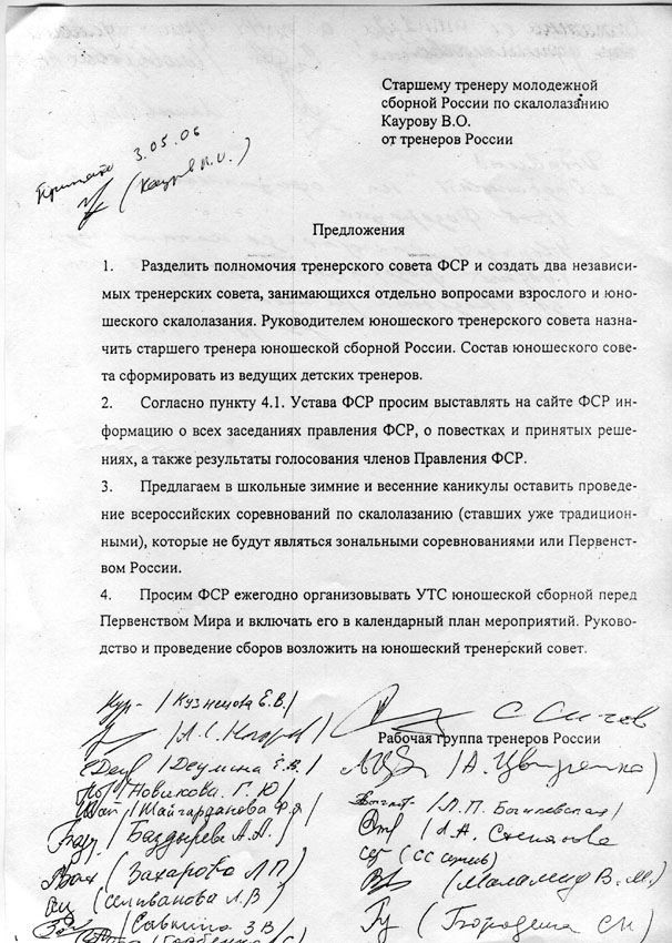 Ряд ведущих детских тренеров написали письмо Старшему тренеру Молодежной сборной России. Списка подписавших у нет, так как письмо подписывалось в процессе соревнований и каждый тренер мог согласиться с частью предложений или добавить свои. Поэтому эта публикация неофициальная (просто для информации о том, что происходит). Подлинник письма был передан В.О.Каурову. Он сказал, что большая часть вопросов вне его компетенции. Просьбу передать это письмо в Президиум ФСР на рассмотрение принял с неохотой. Затем подошел А.Е. Пиратинский. Его реакция была такой: "Мне некогда отвечать на всякие писульки".