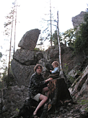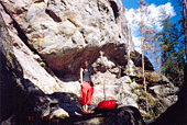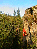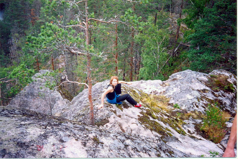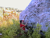 Второй предложенный мной проект так и остался проектом - старт со «Стрекозы», траверс направо и выход по «Колобку». Очень длинные дохваты почти без ног, по сильно шершавым маленьким слопперам. Закатившись в щель между сосной и основанием камня при очередном подходе, я прекратил попытки. А то кожа на теле поистерлась совсем.