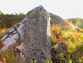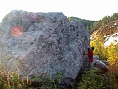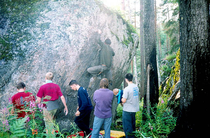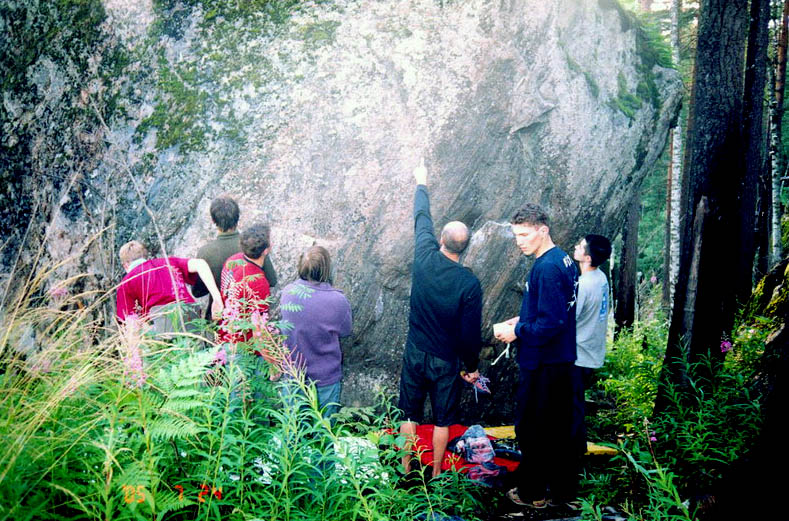 До сих пор не рассказал про большой камень в лагере. Как же так! В принципе я готов туда ехать только ради него, осталось на нем пара почти собранных очень интересных проектов. Здоровенный валун, по десятку метров в каждой стороне основания и высотой метров до 6-7 в высокой части и метра 4 в низкой. Одна самая заросшая сторона довольно положительная с небогатым рельефом – по ней не лазали. Одна почти вертикальная, но все-таки имеющая положительный уклон, что не мешает ей быть гораздо тяжелее противоположной нависающей стены. Не упомянутая стенка – самая интересная – 35-40 градусов наклона.