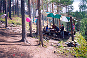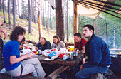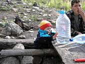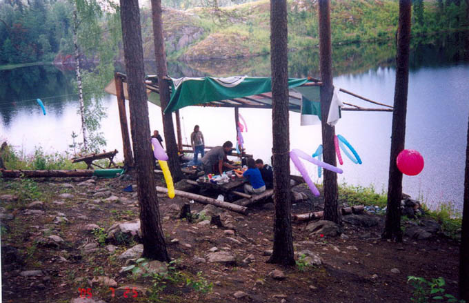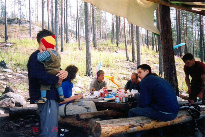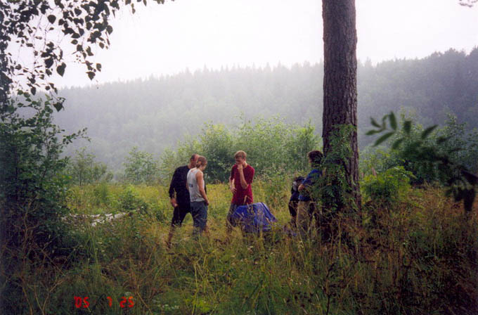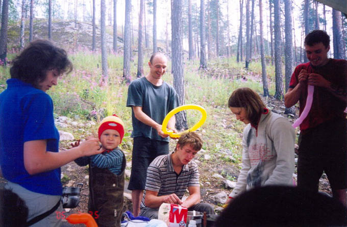 Поскольку всех девчонок мы отправили в Москву, да и день оказался вне раскладки, у нас возникли проблемы с пожрать. Все проблемы решили ребята с соседней стоянки (те самые, которым мы передавали знания о новых боулдерингах), пригласив нас на прощальный пир. Спасибо и вам! Пиво, сосиски и горячий чай (когда закончилось пиво), что может быть лучше! Оказалось, что сырые сосиски вкуснее жаренных, потому что быстрее готовятся, и что ребята не знают про баурок! Но мы передали им и эти бесценные знания. Оживленно обсуждая известные для всех скалолазов животрепещущие темы, мы с Илюхой заметили, что половина собеседников заснула, попрощались с другой половиной и двинули досыпать в свой лагерь.