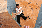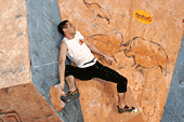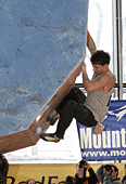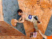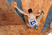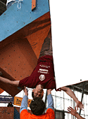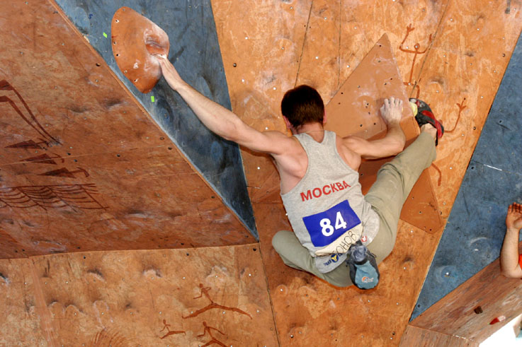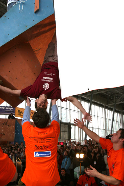 Четвертая трасса. Старт с мерзкого пассива, уход направо, на два мизера (правый - бонус). Некоторые спрыгивают вниз, держась за них руками в висе, другие встают на них ногами и уходят дальше, еще правее, на равновесии. И, наконец, финиш. Нарисованный очерченный прямоугольник на краю щита. Первые два финиша сделаны явно за счет роста. Встав на цыпочки, участники прикладывают к финишу кончики пальцев. Трасса явно «анти-Гельм». Итак, как же полезет Рустам? Рустам с легкостью стартует, подходит к финишу, понимает, что дотянуться до него он не сможет, а зацепок ни под какие конечности больше нет, и прыгает на ребро. Не удерживается, падает. И, несмотря на оставшиеся две минуты, идет подписывать листок. Боязнь упасть при срыве спиной на треугольный рельеф, как думает А.Нагоров? Вряд ли… Скорее элементарная человеческая обида на явную несправедливость. И, наконец, Салават. Да, он повыше, но необходимых сантиметров тоже не хватает. Салават берет край гриба осторожно, перехватывает туда же вторую руку, перекидывает первую. И… финиш в висе на краю гриба! Это уже мастерство, его не пропьешь.