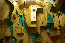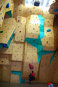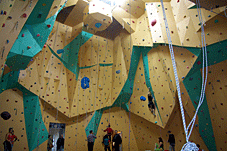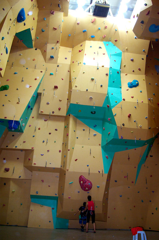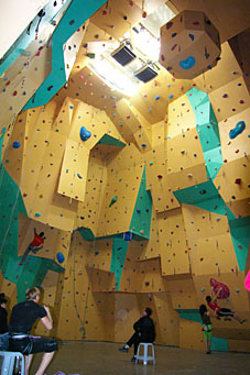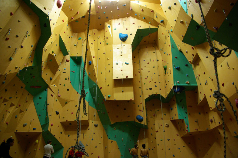 Его уникальность в том, что находится он в специально построенном именно для скалодрома здании необычной формы - 4 этажа вспомогательных помещений (гардероб, раздевалки, туалеты, души и т.п.) и сам спортзал со стендом.