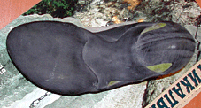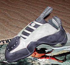 Очень оригинальный дизайн. Не в плане цветов, а в том смысле, что форма тапка продумана до функциональных мелочей. Например мысок сверху покрыт резиной дабы скалолаз мог поддевать им зацепы. Это важный момент для любого боулдериниста (скалолаза) потому что на трассах часто встречаются сложные места, в которых просто необходимо хорошо запереть ноги. Запирать ноги в Stix'ах для меня одно удовольствие (иногда смешанное с болью - в зависимости от зацепок :), т.к. кожа на скальнике лёгкая и достаточно тонкая, чтобы почувствовать зацепку ногой тапок. Кожа скальника, кстати, за 2 месяца так и не протёрлась ни в одном месте. Пятка у Stix`а сделана из тонкой резины. Это позволяет лучше чувствовать зацепку, когда ставишь пяточку на неё. После лазания в Scarpa'ах меня волнует странный вопрос - почему до недавних пор пятки у скальных тапок были "толстокожими", такими же, как и подошва? Ведь для удобного лазания необходимо чувствовать зацепки через скальники как можно острее. И когда ставишь, запираешь пятку, то ты должен знать наверняка, что она не сползёт с зацепки, или, по крайней мере, знать, когда она уже не держит. Поэтому у новых моделей Scarpa (в т.ч. и у Stix`а) есть определённый плюс - это форма и резина пятки. Резина мягкая, а сама форма надёжно обтекает пятку.