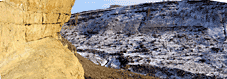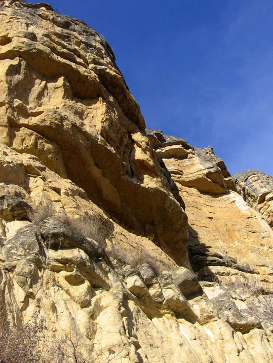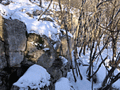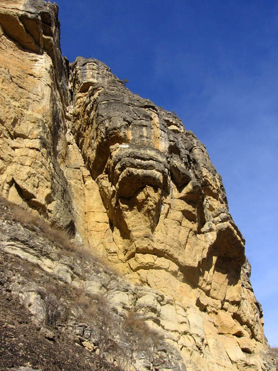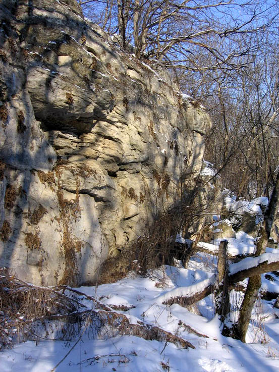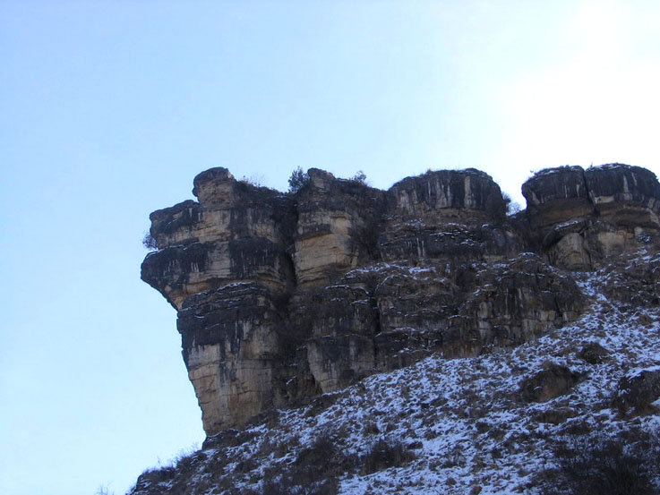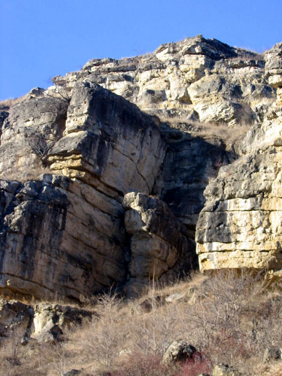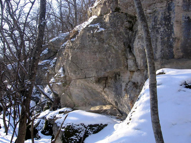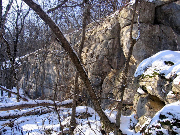 Рассказывать про скалы дело довольно сложное и все равно сведется к междометиям. Так что попробую изложить основные моменты. В основном это известняк жесткий, местами мягкий, очень много карнизов и потолков, есть нависания и вертикали. Имеется много прикольных низеньких (4-5-6м.) боулдеринговых выходов, всяческие гроты со здоровыми потолками итп. Жалко, что камней мало, хотя я не искал. На самом деле район перспективный. Очень. У меня есть несколько проектов 8а, и один в районе 8с (несколько движений я так и не сделал, а остальные насасывал очень долго с верхней страховкой).