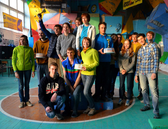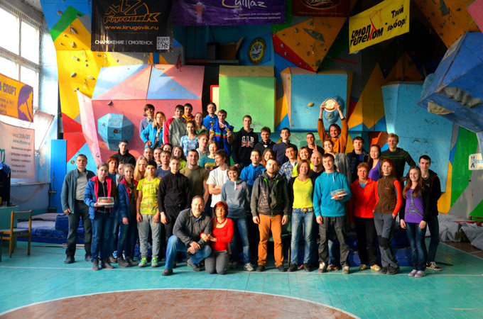 В конце марта в Смоленск снова съехались скалолазы на традиционную Смолу. На два дня наш школьный спортзал опять превратился в Царство боулдеринга. Была построена ещё одна плоскость, теперь их стало уже шесть. 29 марта в 10 утра началась весенняя битва двух команд: 107 спортсменов из Москвы, Минска, Санкт-Петербурга, Калуги, Орла, Бобруйска, Гомеля, Могилёва, Екатеринбурга, Ижевска, Смоленска сражались с четырьмя отважными подготовщиками - Игорем Гусаком, Ваней Борщевым, Володей Трабуровым, Ваней Калентеенковым. Команда постановщиков подошла к этим соревнованиям в отличной физической и технической форме и была мотивирована, как никогда.