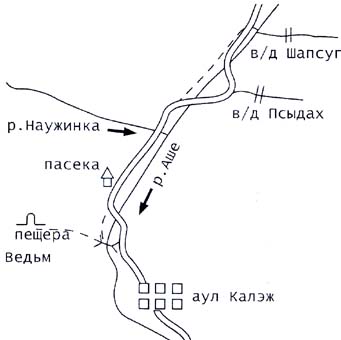 Отправным пунктом служит поселок Лазаревское, куда можно добраться автобусом или электричкой. На автостанции в Лазаревском следует взять билет на рейс №148. Автобус идет вдоль моря, минует поселок Аше (куда также можно добраться на пригородной электричке), поворачивает в горы, и через 50 минут мы оказываемся в ауле Калеж (в переводе с адыгейского - «старый город»). Это бывший поселок Красноалександровский-2. От конечной остановки автобуса (сюда можно добраться и на попутных машинах) пешком проходим вперед 50 метров до развилки дорог. Поворачиваем влево к реке и идем вдоль нее вверх по течению до первого подвесного моста (15 минут от автобусной остановки).