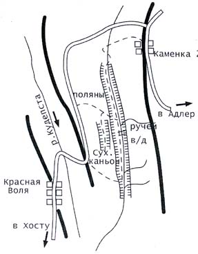 Почти два часа путешествия по каньону - и слева в него впадает Каменский ручей. Здесь развилка: одна маркировка уводит через заросли самшита вправо вверх. Тропа от Каменского ручья вверх вправо через 20-25 минут выводит к полям с мирно пасущимися коровами. 50 метров не доходя до конца этой тропы, влево отходит другая тропа маркированная зеленой краской, которая через несколько сот метров выводит к так называемому Сухому каньону. Тропа ведет через сухой чистый лес, в котором осенью много грибов. Сухой каньон трудно даже описать - лучше его один раз увидеть, он оставит неизгладимое впечатление.