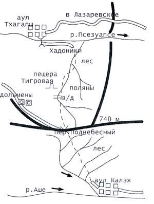 На самом перевале - развилка. По левой широкой каменистой дороге можно примерно через 4 км добраться до дольменов (и 4 км обратно) - это если у вас еще осталось много сил и желания по жаре проделать этот путь, который, кстати, маркирован с добавлением буквы «д» - дольмен. Один дольмен сильно разрушен, другой сохранился довольно неплохо. Маркировка идет только до них. Следите за ней! По правой лесовозной дороге, вдоль высоковольтной линии, резко спускаемся до следующей развилки. Спускаемся резко вниз вправо по красным маркам и через 20 минут от перевала находимся на слиянии двух ручьев, переходим их, поднимаемся чуть вверх и сворачиваем влево. Выходим на поляну со скамейками - обычное место отдыха туристов. Рядом спуск к водопаду, а чуть ниже на дереве табличка-указатель: «Тигровая пещера». Тропа пересекает несколько ручьев и подходит к первым домикам поселка Хадоники (ул. Черемуховая). Дорога идет к реке, потом вдоль нее, висячий мостик подходит к асфальтовой дорожке и аулу Тхагапш, откуда автобусом №146 в Лазаревское. Последний автобус отходит из аула в 19 часов.