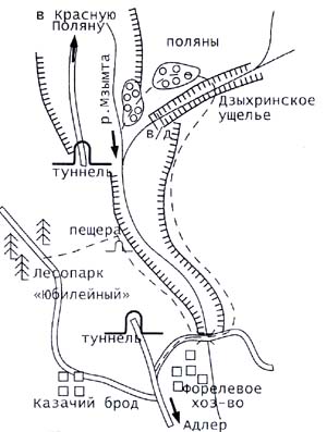 Это маршрут находится в Адлерском районе Сочи, и начинается он от Форелевого хозяйства, куда можно добраться от Адлера на автобусе №135 и различными маршрутками (например, №105ф из Сочи от автовокзала). Мимо ресторана и жилых домов путь лежит к висячему мостику, перейдя который, поворачиваем резко влево и по маркированной тропе идем вдоль края Ахштырского ущелья. Примерно через 40 минут подъема, по ходу которого разворачивается неповторимая по красоте панорама отвесных, уходящих на сотни метров вниз скальных стен, подходим к развилке троп. Марки на деревьях и камнях уходят вниз в боковое ущелье.