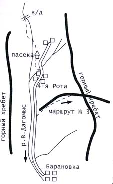 Если идти, никуда не сворачивая и без больших перерывов, то через 1,5-2 часа пути можно дойти до разбросанных домиков селения 4-я Рота. Это примерно 7 км от Барановки. Идем по этой же дороге через сады и огороды, поднимаясь вверх. В этом селении, метров в 600 от начала, за крутым поворотом дорогу пересекает маленький ручей, впадающий в реку В. Дагомыс. От ручейка маркированная тропа отходит влево, дорога же, поднимаясь круто вверх, уходит через ореховые сады к дальним домикам селения.