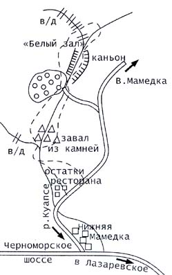 По дороге проходим мост через речку, поднимаемся чуть вверх и идем до двух больших обломков скал. Здесь красные метки уходят вниз к реке, к остаткам ресторана. В 50 метрах от разрушенного ресторана тропа уходит в сторону реки и вскоре подходит к мостику. Недалеко от него русло перегорожено большим каменным завалом. Глыбы желто-серого песчаника хаотически нагромождены друг на друга. Слева небольшой водопад. Тропа обходит завал с левой стороны, поднимаясь высоко над рекой, и идет по дубово-грабовому лесу. Можно обойти завал и справа, перейдя по камням речку, и дальше двигаться по руслу реки, или сделать это на обратном пути. В любом случае нужно идти вверх по течению до Ореховой поляны (30-35 минут) - остатков адыгских садов. Сейчас в тени деревьев устроены навесы, столы и скамейки - удобный привал для путешественников. На Ореховую поляну можно приехать и на машине по дороге на левом берегу речки. Так обычно возят отдыхающих с побережья, отрывая их летом от пляжа. Выше Ореховой поляны - развилка. Правая тропа ныряет в ущелье,- а левая ведет к водопадам. Идем по первой, а возвращаемся по второй. В ущелье перебираться с берега на берег нужно по крупным камням в воде, чтобы не намочить ноги. Красочные обрывы из слоистых известняков местами нависают над водой, образуя карнизы и ниши. В одном месте речка протекает в полутемном каменном туннеле - настолько узко сомкнулись над водой противоположные берега. На высоте 3-5 метров встречаются короткие каменные сосульки - сталактиты - естественные натеки, состоящие из углекислой извести.