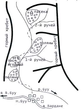 С отрога спуститься к тракторной дороге, которая выводит к вышеуказанной поляне с домиком. Подъем и спуск с отрога не маркированы. Они занимают примерно один час пути дополнительно. Возвращение в Вардане по уже знакомому пути.