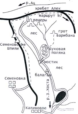 Перемычка подводит к хребту Алек. На парящую птицу похожа гора Большая Чура (2490 м), которая стоит в истоках реки Сочи. Ближе к вам расположена вершина Иегош (1790 м) с огромным горбом, спускающимся в реку Сочи, а также невысокий хребет Ац. Хребет Алек, тянущийся почти на 18 км параллельно берегу моря, весь изобилует пещерами. Поворачиваем направо согласно желтым меткам, оставляя за спиной вершины Сахарную и Амуко. Через полчаса от поворота на небольшом понижении спускаемся вниз вправо - к истокам реки 3. Хоста. Обратите внимание: красная маркировка - это уже другой маршрут! Пять минут спуска, и вы выходите на заросшую узкую дорогу. Если повернуть налево, то скоро выйдете на тропинки, ведущие к нескольким пещерам. Самостоятельно входить в эти пещеры небезопасно. Не рекомендую. Да и времени нет. Из пещер вытекает множество ручейков, некоторые из них текут под землей. От крутого спуска с хребта поворачиваем по лесной дорожке направо и менее чем за час спускаемся к мостику через речку. По пути часто встречаются остатки навесов и шалашей спелеологов, которых частенько можно встретить здесь. На деревьях замечаем красные марки, ведущие к гроту Барибана (чуть выше мостика через речку). Остается 8 км (2 часа пути) до развилки дорог на поселки Калиновое Озеро и Калиновое. По дороге проходим мимо небольшого рукотворного озера. Эта часть пути совпадает с маршрутом к гроту Барибана, поэтому вместо желтых марок путь указывают красные марки. Впрочем, широкая дорога здесь одна - заблудиться невозможно.
