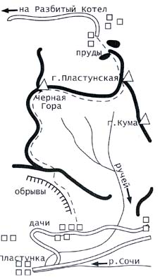 Подъем по тропке до гребня, который расположен выше обрывов, займет 40-45 минут. Местами тропа заросла труднопроходимыми кустами азалии и черники. Иногда она подходит близко к обрывам. Необходимо соблюдать осторожность. Сильный порыв ветра может свалить в глубокий обрыв. На гребне следует повернуть налево! Тропинка бежит то вверх, то вниз, несколько раз петляет и наконец поднимается на вершину горы Пластунской, заросшую лавровишней и рододендроном. Здесь лучше всего отдохнуть и пообедать. Прекрасный вид на море и побережье города. Далеко внизу разбросаны дачи и домики селения Разбитый Котел. От вершины спускаемся по склону, обращенному к морю. И через 20-25 минут можно подойти к дачному поселку Черная Гора, откуда по грунтовой, а далее асфальтированной дороге менее чем за 1 час доходим до селения Разбитый Котел. Автобусом №117 выезжаем в Сочи или №107 в Дагомыс.