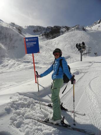 Зима субтропическая, смею заметить, дело весьма своеобразное. Выходишь утром, рано-рано, с лыжами на плече. На улице еще темно, но тепло, птички чирикают во всю, заливаются прям (это тоже сразу замечаешь), асфальт сухой, ни намека на зиму, собственно. Прыгаешь в «Ласточку» и через час-полтора ты уже в сугробе. Солнце, лыжники какие-то модные - премодные вокруг тебя, сноубордистки…еще бы все-все катались также круто, как одеваются... Но нам-то чего, приезжим и неопытным, лыжки свои смиренно обула, чужие в смысле, своих нет пока, палки трекинговые вместо лыжных под свои 160 см. роста подкрутила, помолилась мысленно и поехала..по зеленому склону…