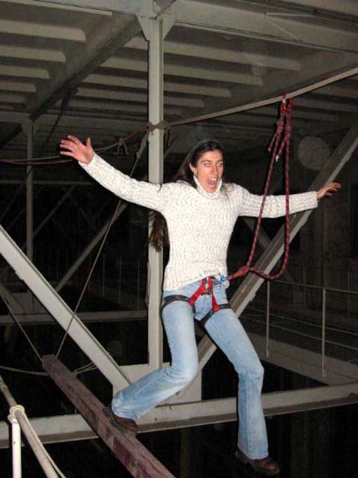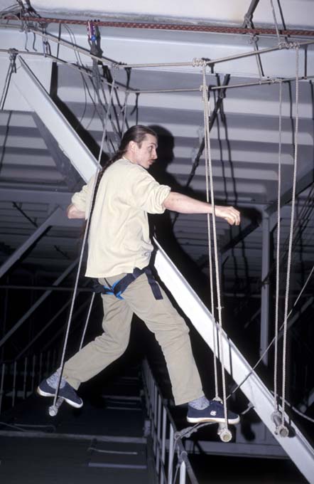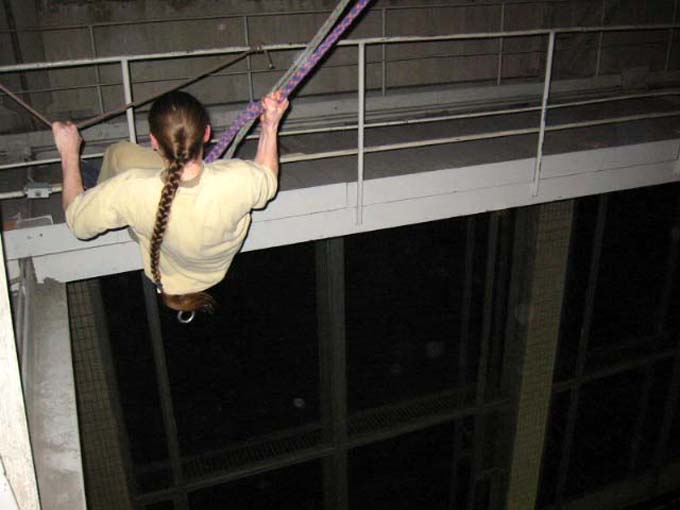 веревках шатающейся доске, и лазанию вниз головой по пятиметровой потолочной