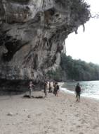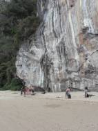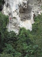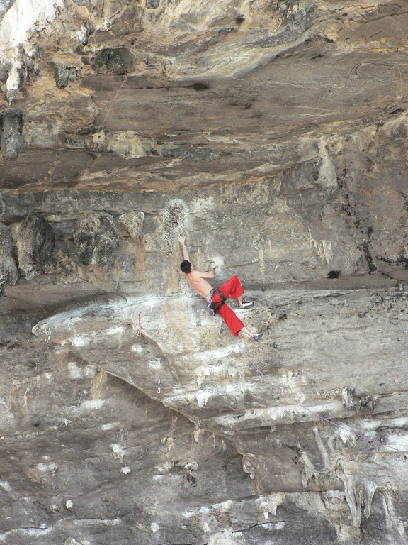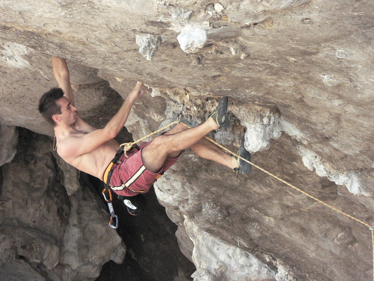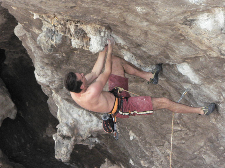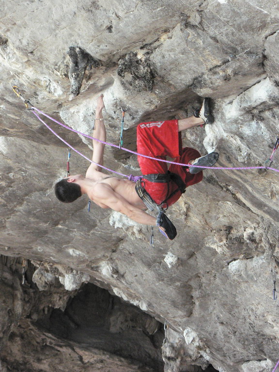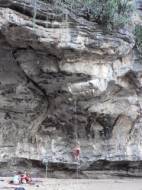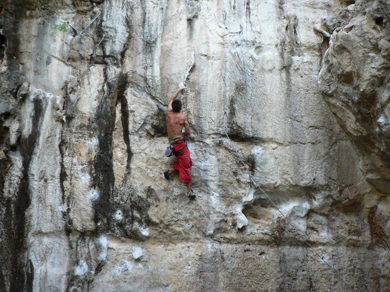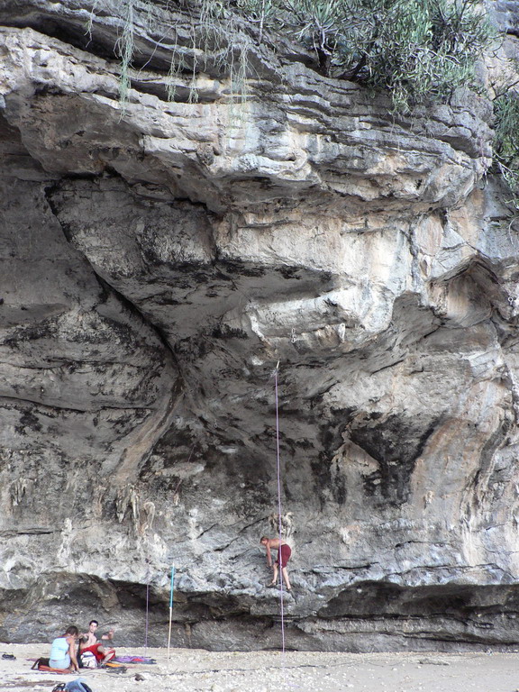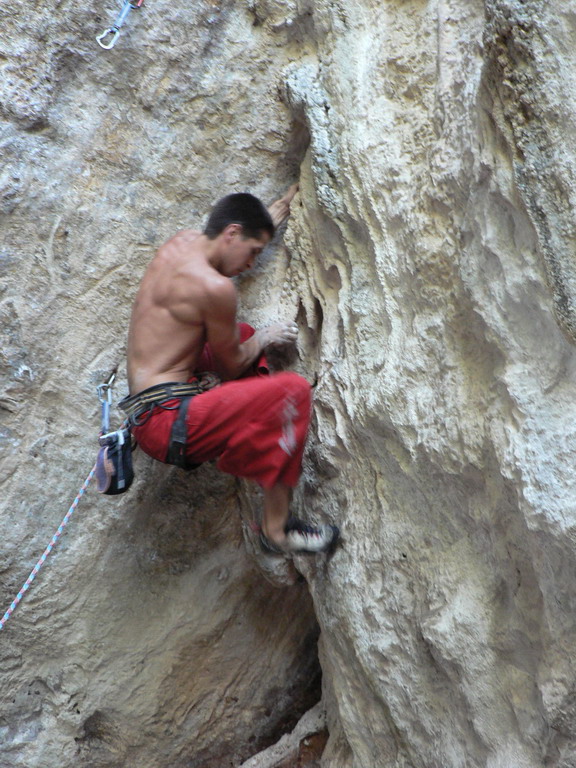 Вообще, надо сказать, что скалы очень необычные. Преимущественно нависающие и потолки, куча колонетов, сталактитов, да что там говорить… смотрится все это очень эффектно. Практически отсутствуют маленькие активные зацепки, в основном ручки, большие пассивные полки, дырки и куча разных видов «щипков». Часто встречаются хваты типа «обними сосульку ногами», «заклинь колено под эти сопли», а одна особо оригинальная 7с+ «просила» развернуться в ключе вверх ногами и заклинить их в щели, после чего руки можно было вообще отпустить и, вися вниз головой, отдыхать.