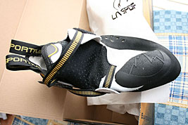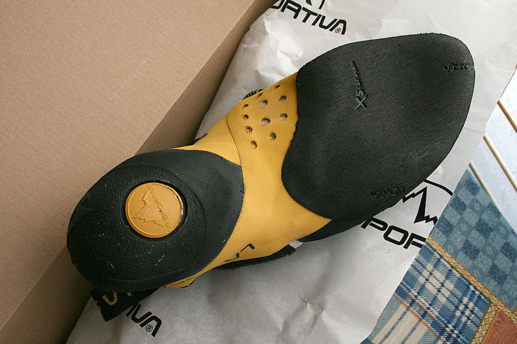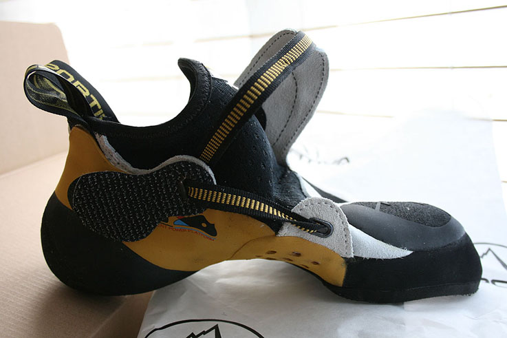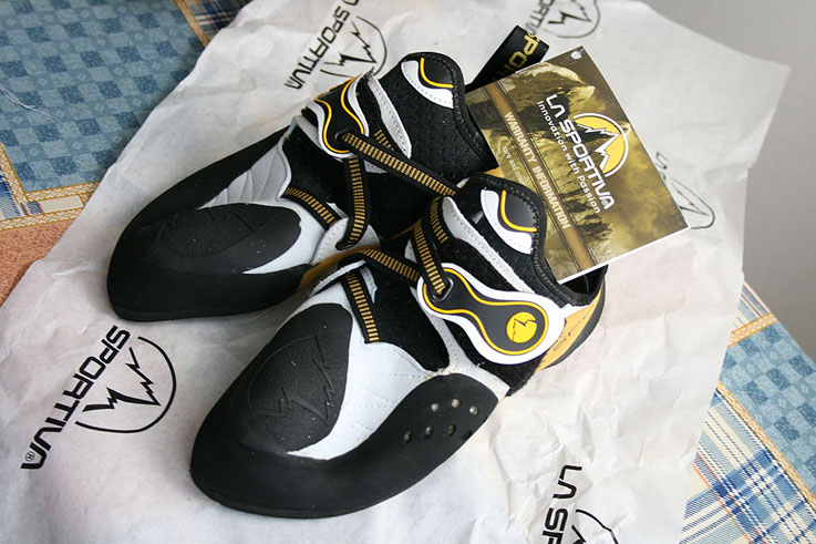 Не буду пересказывать официальные реляции La Sportiva, для ознакомления с ними можно обратиться к каталогам и материалам сайта. Расскажу, что узрел, пощупал, понюхал и распробовал на вкус. Итак. Изначально тапки ожидались как болдеринговые, идущие на смену полюбившейся многим спортсменам, но покинувшей их Mantra. Видимо это натолкнуло «Спортиву» на серо-черное цветовое решение изделия, правда, с желтыми «вкраплениями». К левому тапку прикреплена книжечка о гарантии нового образца, с цветной полиграфией, но как всегда без раздела на русском. В конце, о новость, объявление о возможности при регистрации на сайте участвовать в розыгрыше бесплатной пары обуви. Желание немедленно броситься к компьютеру, было грубо прервано пометкой внизу страницы «только для США». Буржуи проклятые. В остальном книжечка свет истины в себе, к счастью, не несет, перекликаясь с книжечками предыдущих моделей.