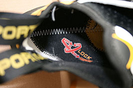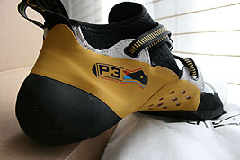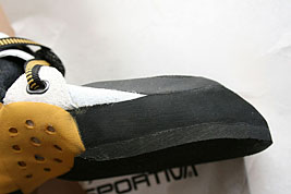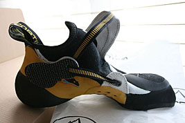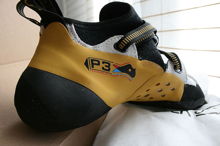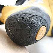 Есть и революционные, по словам рекламы, новшества. Это две широких желтых резиновых полоски, идущие наискосок от середины стопы к пятке. Этот элемент по задумке разработчиков обеспечивает плотную посадку тапка на пятку и более надежную фиксацию стопы, что для болдеринговых туфель – «слипов» типа Cobra, Venom и Viper являлось слабым местом. Что ж, поживем – увидим. Пока, на первый взгляд, это выглядит калошей, правда действительно плотно облегающей стопу. Но положительные отзывы уже поступают. Также обращает на себя внимание резиновая накладка на носке. Как и черная часть массивной, в ущерб чувствительности, пятки, упомянутая накладка выполнена из мягкой, липкой на ощупь резины с «выпирающим» зубчатым «спортивовским» профилем и рифлением, что должно  обеспечить хорошее сцепление с поверхностью. В принципе, по первым отзывам, пятка действительно «цепляет» очень хорошо. Однако маленькой бочкой дегтя в нашей огромной ложке меда является то, что, возможно, использованная резина будет, в силу своей мягкости, сильно подвержена стиранию. Это, в свою очередь, позволит оставлять нам на стендах в качестве свидетельства своего пребывания особо жирные черные полосы. Также вполне возможно, что при лазании на открытом воздухе материал будет исправно собирать пыль и прочий дорожный мусор.