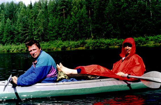 идет дождик. Мы сцепляем байдарки вместе, накрываемся тентом и сползаем