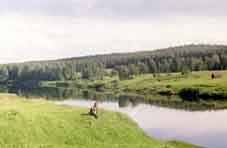 деревня сменяет другую, берега низкие, лес далеко. Наконец находим что-то