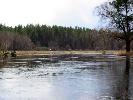 порядочной речке, разливается, заливая все окрестные поля, в воде стоят