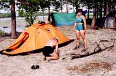 раздавливанием очков своей же пятой точкой и бурным сексом со мной в палатке.