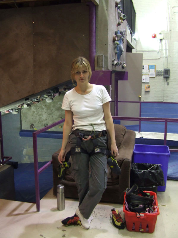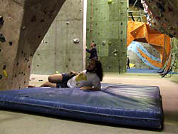 Есть существенные отличия в подходе к безопасности и страховке. Каждый человек, пришедший первый раз на этот конкретный скалодром, должен пройти "Belay test". В "Toronto Climbing Academy" это выглядит примерно так - ты должен правильно надеть обвязку, завязать восьмерку, ну и должен уметь страховать с помощью gri-gri (на веревках для верхней страховки есть стационарные gri-gri с якорем. Карабин использовать лезущему не разрешают - будь добр каждый раз вяжи восьмерку:) ). При этом если ты чего-то делаешь неправильно, то тебе все объяснят. и тест ты все равно пройдешь. Этот тест бесплатный. Если хочешь лазать с нижней страховкой, то нужно пройти еще один тест, который стоит 375р. ($15, канадский доллар стоит около 25 рублей. Для удобства буду писать все цены в рублях). При желании можно взять небольшой курс обучения лазанию с нижней страховкой, но это уже довольно дорого - кажется 2600р. (это за несколько занятий с инструктором, сколько - точно не знаю, мы этот курс не брали). На тесте обязательно заставляют прыгать так, чтобы пролететь пару-тройку метров. У нас с Таней разница в весе килограмм 40, так что Таню попросили пристегиваться самостраховкой к якорю:). При этом весь пол на скалодроме покрыт матом. Не очень мягким (рядом с болдеринговой стенкой есть дополнительные маты, правда по-моему их не хватает), но все-таки не бетонный пол в ДДС:). Думаю, даже с десяти метров это сильно уменьшает травматичность.