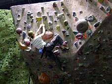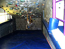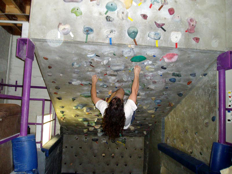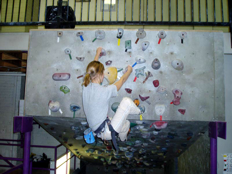 Еще есть интересное отличие в стиле трасс. По нашим ощущениям, здесь больше любят плохие зацепки. То есть если в Москве (ДДС и Скала) типичны трассы с хорошими зацепками, но зато сложными движениями, то здесь чаще бывают трассы по очень плохим зацепкам, но не с такими сложными перехватами. Правда, бывают исключения. Вот, например, на потолке в пещере обычно есть одна довольно простая трасса, и она, конечно, идет по ручкам. Зато была трасса совсем по мизерам - на ней, кажется, толще сантиметра было всего две-три зацепки (трасса была на вертикальной стене, 5.10+. Пальцы после такого издевательства отваливались:) ).