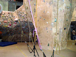 Из отличий от московских скалодромов, в первую очередь хочется отметить, что на скалодроме есть довольно много совсем простых трасс - начиная от 5.4. На практике это означает, что практически любой человек, первый раз пришедший на скалодром, в состоянии хотя бы что-нибудь пролезть. Трассы есть от 5.4 и до 5.13+, больше всего, пожалуй, трасс 5.9, 5.10-, 5.10+ и 5.11- (каждой категории штук по 5-6). В отличии от московских скалодромов, трассы часто меняют. В среднем, каждая трасса висит месяца три. Трассы отмечены разноцветной изолентой, что, по-моему, более удобно, чем цвет зацепки. В категориях здесь почему-то вместо a,b,c,d используют + и - (может это еще какая-то система, которой я не знаю?). Кстати, таблицы сравнения категорий резко разходятся с нашими ощущениями: здесь мы лазим 5.10+ и 5.11- с верхней страховкой и 5.10- и 5.10+ с нижней.