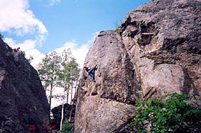 По боулдерингу ничего сообщить не могу, к сожалению, руки не доходят, а народ наш местный как-то без энтузиазма относится к чистке скал. PP вот был у нас, почистили пару камней - думаю, ему есть что поведать (от редакции - отчет РР). На массиве в Пальцево (это где микст был) за эту осень усилиями Стаса Чвиженко, Андрея Варваркина, Дениса Вейко ну и снова меня пробито 10 маршрутов. В основном, на массиве у дороги. Били под микст, поэтому трассы можно лезть и зимой и летом:). Маршруты у дороги до 10м высотой, категории от 5с до 7в+/7с. На основном массиве 6 штук высотой до 12м, хотя сам массив имеет макс. высоту метров 15-18. Из них только одна 6а, остальные точно 7ки, одна может быть 8. Прямая такая узкая щель на слабом нависании, метров 10-12.
