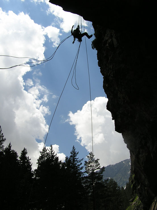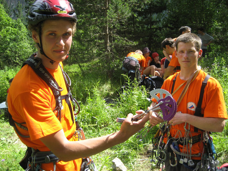 На постановку трассы ушло 5 дней. Трасса Школы - примерно 4-5 веревок: со старта 2 веревки сложного лазания под карнизом с 10 м маятником, затем веревка косого дюльфера, затем еще одна веревка лазания и финишная веревка, представляющая из себя эффектный дюльфер с нависания на землю.