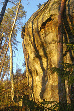 (прилагаемая карта) была найдена неплохая скала. Высотой около 10-12 метров, с небольшими нависаниями и одним достаточно сильно нависающим