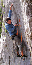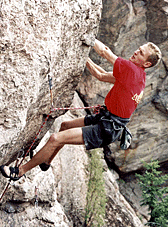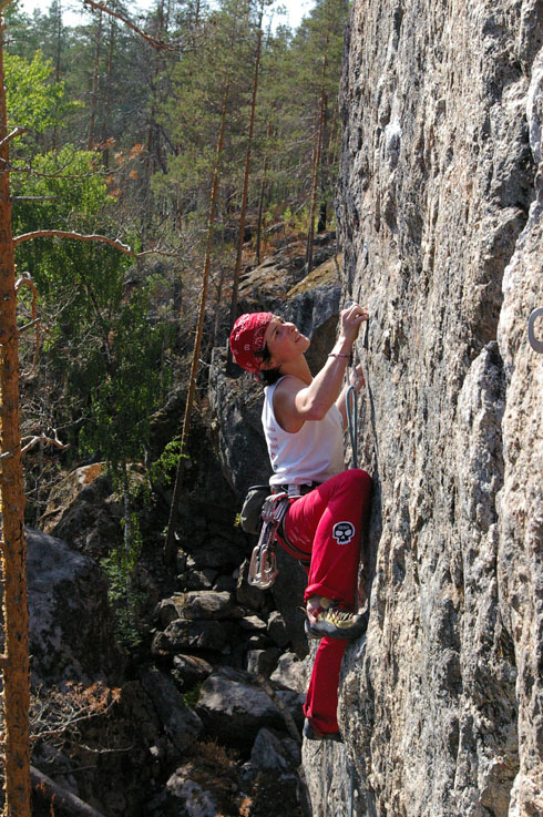 Вера Кучерявая на скалах “Толстяка”. Соревнования ”Onsight Марафон”. Коуровка, Урал. Июнь 2004г. |