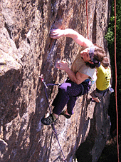 Михаил Шишляев. ”День независимости ”, 7а. Озеро Треугольное, массив ”River Crag” (Новый массив, найден в этом году. Первый из пробитых М.Овсянниковым маршрутов на массиве. 12метров. Лазание несложное. Основаня проблема – ярко выраженный ключ посередине) Карелия. Июль 2006г. Вылез… |