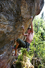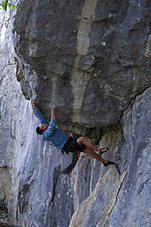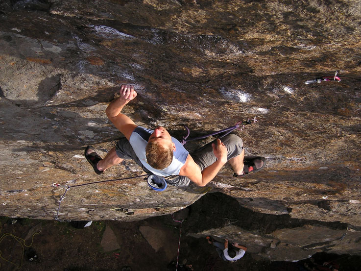 Владимир Мурзаев. ”Catharsis”, возможно 9а. Маршрут проходит по 15ти метровому нависанию. Длинные перехваты по маленьким зацепам, мест для отдыха практически нет. Парочка ярковыраженных ключей (не менее 7cFB).Озеро Треугольное, сектор ”Е”. Карелия. Июль 2006г. Не вылез… |